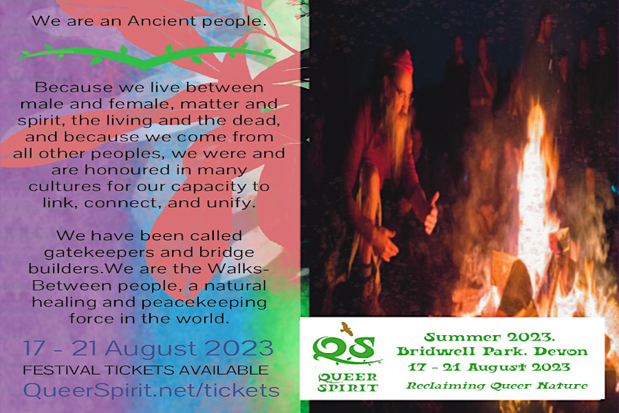 At Queer Spirit Festival we are ‘Reclaiming Queer Nature’ as natural, spiritual and sacred: embracing the creativity, insight and joy that nature gifts us; exploring how the dance of the genders within opens gates to the spirits of nature and transcendent experience; re-discovering how same sex love was once regarded as mystical and magical; remembering how queer people were respected in cultures the world over that honoured the sacred feminine. In Africa queer people were known as Gatekeepers, in ancient Europe and Middle East we served in Goddess temples, in America the Two Spirits of the native tribes are reclaiming their sacred roles, which include community ritual, healing, communicating with land spirits, creating rites for the dying, acting as mediators between the genders, between nations, between worlds. The Two-Spirits (who had originally been given the label Berdache, meaning a bottom in gay sex, by European explorers -this term was ditched by the two-spirit community in 1990) are an example from which queer people across the world can learn, as we discover more about the talents and gifts our queer nature brings us, as we answer the call of nature to explore and reclaim our own spirituality, free from religious prejudice.